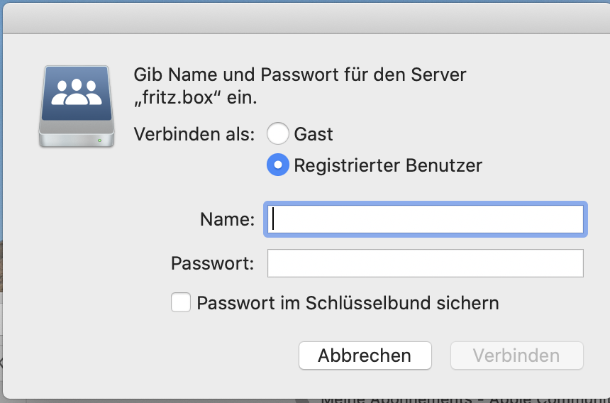 Bei der Anmeldung im Finder "Gib Name und Passwort für den Server "Fritz.Box" ein"