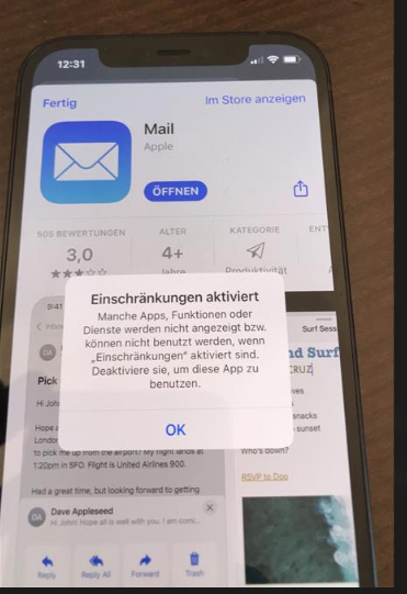 mangels Speicherplatzes, hatte ich auf meinem alten iPhone die vorinstallierten Apps (Facetime, Dateien, Musik, iTunes, Podcast, Maßband, Kompass usw.) gelöscht. Nun möchte ich sie wiederherstellen. Bei der Eingabe im App-Store werden sie mir angezeigt und ich kann sie auch öffnen. Dann erscheint jedoch folgende Fehlermeldung: "Einschränkungen aktiviert. Manch Apps, Funktionen oder Dienste werden nicht angezeigt bzw. können nicht benutzt werden, wenn "Einschränkungen" aktiviert sind. Deaktiviere sie, um diese App zu benutzen."