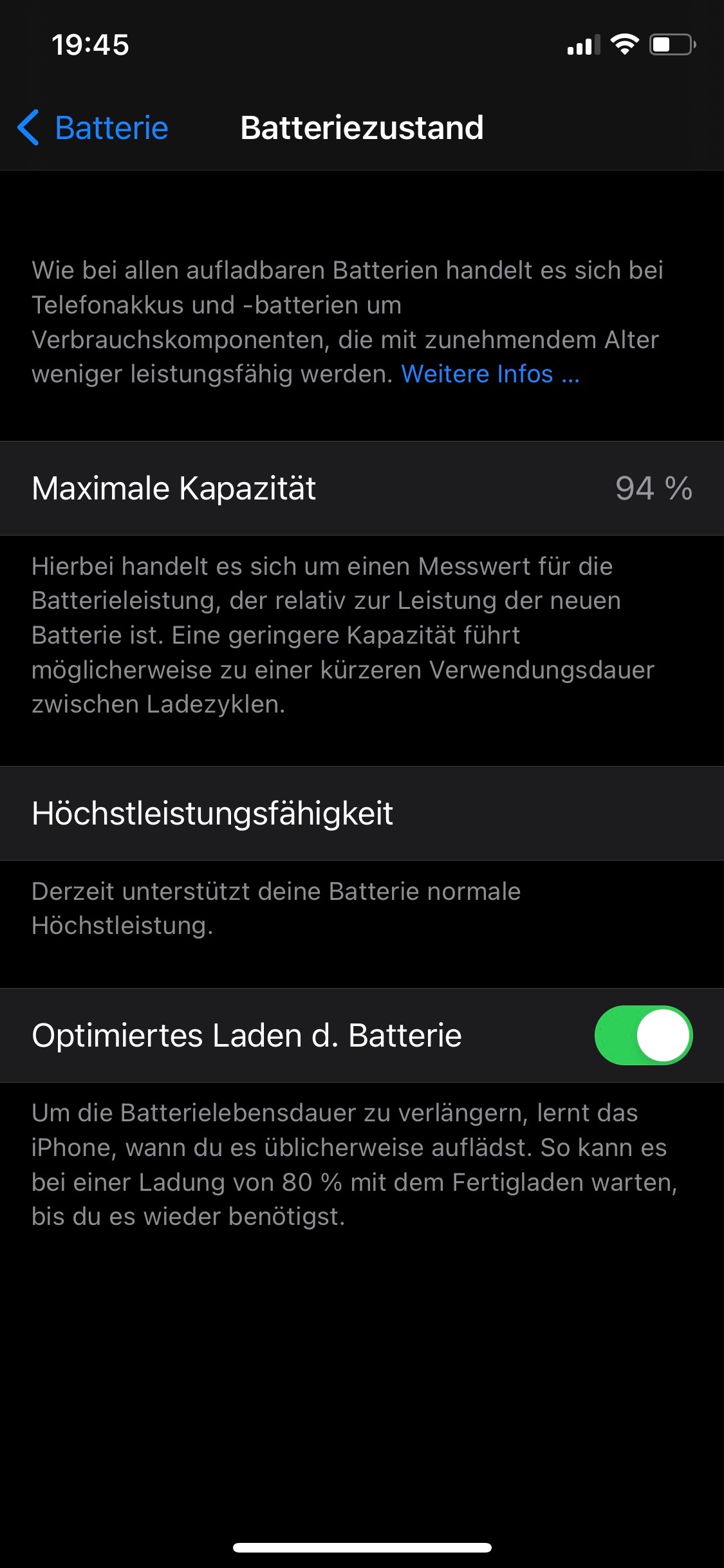 Für das Lademanagement sind Erfahrungswerte erforderlich. Erst nach dem Durchlaufen mehrerer Ladezyklen greift die Erkennung zu deinem Ladeverhalten, sodass erst kurz vor dem üblichen Ritual des Entfernen aus dem Ladeverbund eine Aufladung auf 100 Prozent erfolgt um den Akku zu schonen. Idealerweise sollten die Ladebereiche mindestens 20 Prozent und maximal 80 Prozent nicht (langfristig) überschritten werden, da dies auf Kosten der Lebensdauer der Akkus geht.
