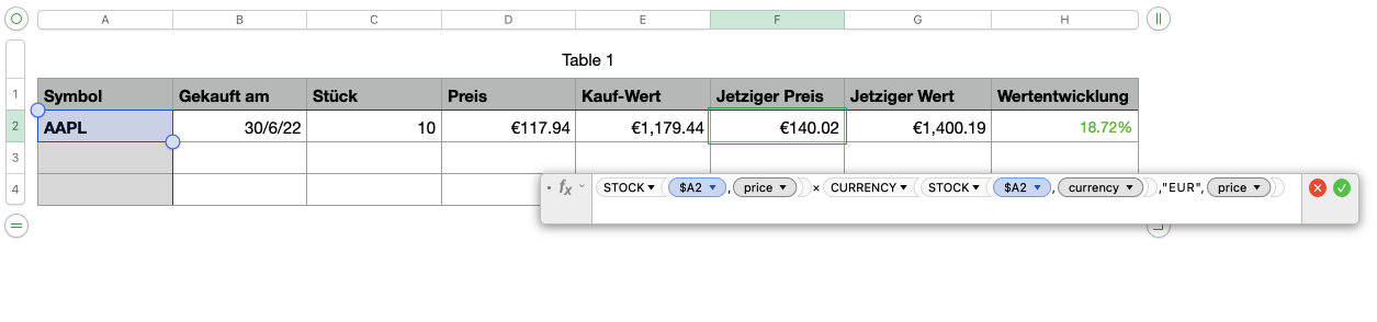 Um den derzeitigen Wert dynamisch mit dem Kauf-Wert vergleichen zu können, musst Du lediglich den Preis der Aktie in Euro umwandeln. Um es wasserfest zu machen, lässt Du Numbers auch die Währung der AAPL Aktie dynamisch ermitteln.