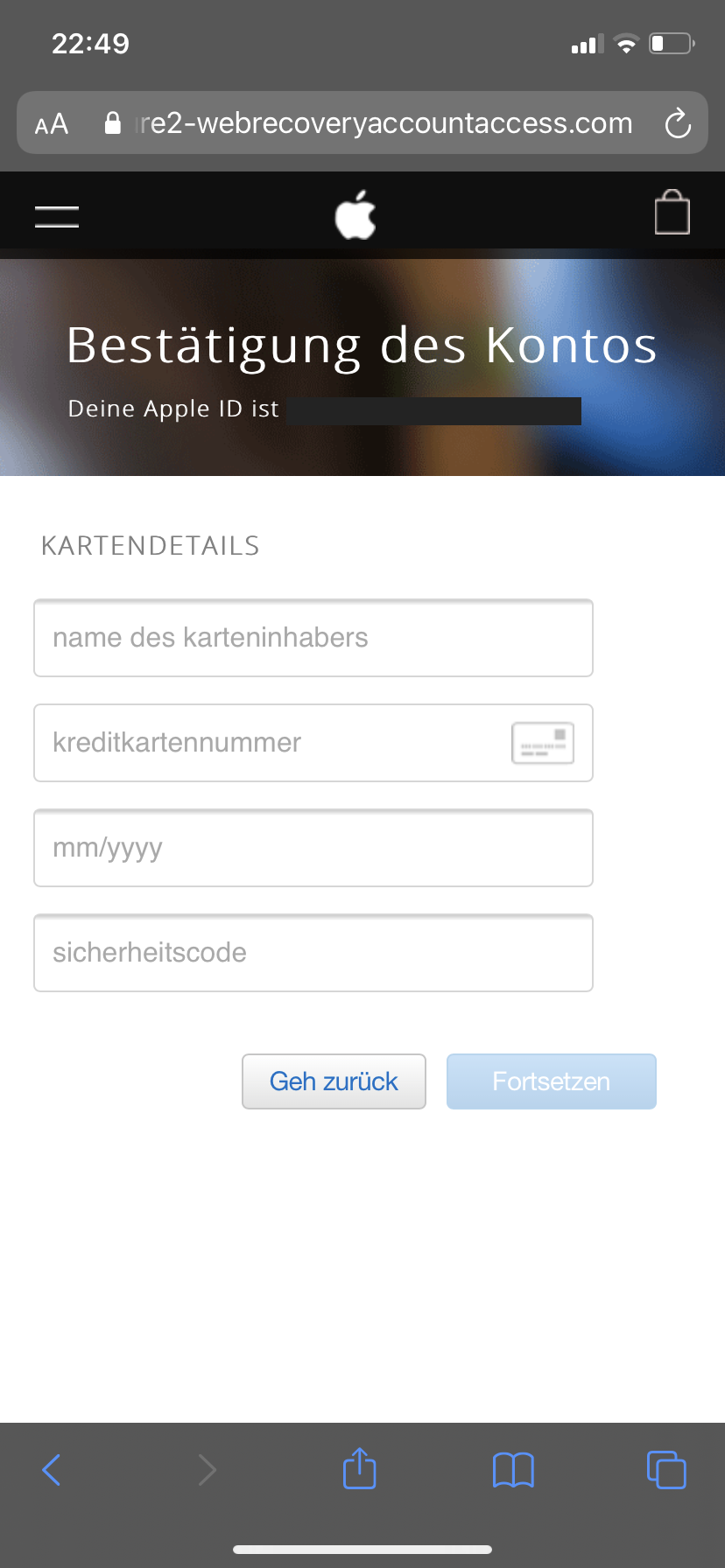 vorhin habe ich eine Email erhalten, dass meine Apple ID gesperrt worden ist. Als ich meinen Apple ID entsperren wollte musste ich einige Daten von mir angeben, was kein Problem war, doch dann sollte ich meine Kreditkartennummer angeben. Ich besitze keine Kreditkarte, also hatte ich auch nichts zum eintragen und ich kann auch nicht auf Fortsetzen klicken ohne eine Angabe zu machen. Könnten Sie mir eventuell behilflich sein?