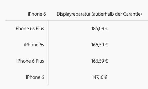 Bei einem iPhone 6s verlangt Apple 166,59€.