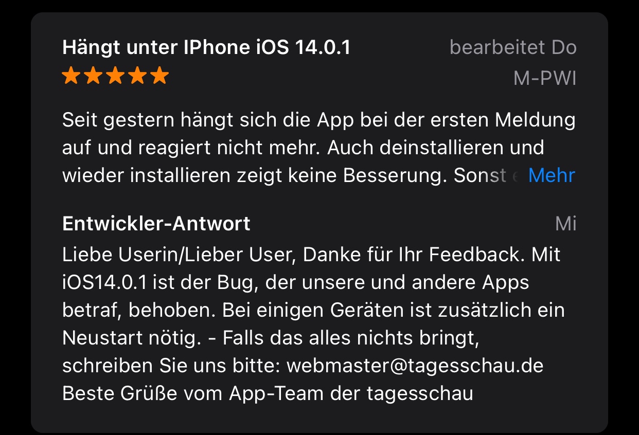 Nach dem letzten Update auf 14.0.1 lässt sich die Tagesschau app nicht mehr öffnen.