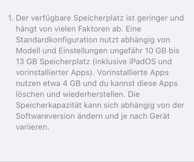ich habe gerade mal in meinem ipad Pro nachgeschaut. System nutzt 7,24 GB, unter "andere" (gehören wohl auch dazu) stehen noch mal 5,1 GB. die Standard Apps wie pages (480 MB, wobei da schon einiges gearbeitet ist), Keynote (464 MB) machen sehr wenig aus. Da ist also viel Luft nach oben. Ich nutze eine aufgebuchte iCloud für Fotos - da ich die mit all meinen Geräten synchronisieren will. "Belasten" also den internen Speicher nicht. Bei meinem mac ist es anders: da habe ich die Fotos als Originale liegen, da ich hier mit time-machine Sicherungen mache. Aber bei 128 GB ist ja für Daten auch einiges an "Luft". Die ersten MacBook Air wurden mit 128 GB Festplatte geliefert. Und reichten sogar erst mal.