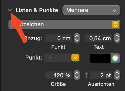 Um die Detailbearbeitung des Listenstils zu öffnen, musste du auf diesen Pfeil ">" vor "Listen & Punkte" klicken. Er dreht sich dann nach unten, und die Bearbeitungsoptionen erscheinen.