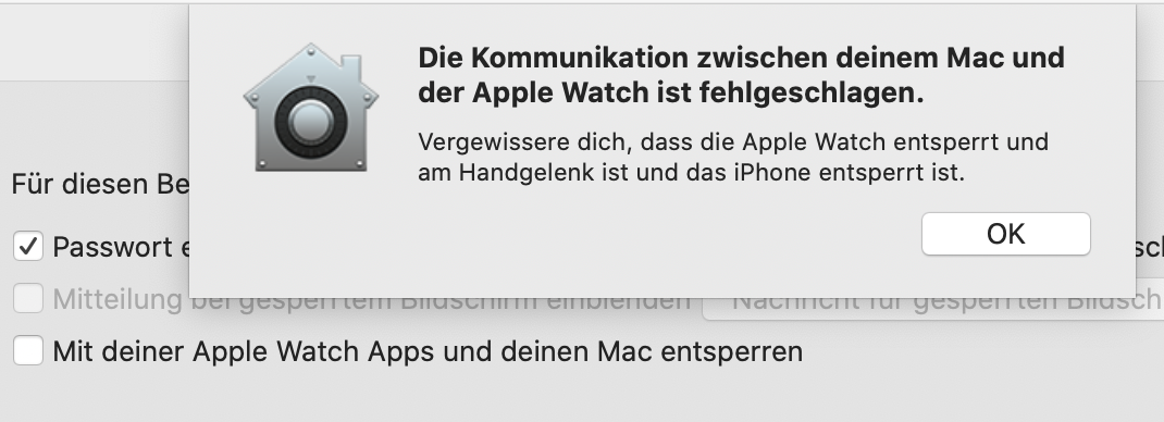 Fehlermeldung: "Kommunikation zwischen Mac und Apple Watch ist fehlgeschlagen. Vergewisser Dich, dass die Apple Watch entsperrt und am Handgelenk ist und das iPhone entsperrt ist.