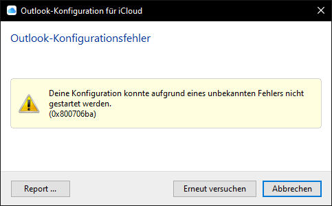 Bei der Einrichtung der iCloud-App auf Windows 10, um meinen iCloud-Kalender mit Outlook365 zu synchronisieren tritt immer wieder ein Konfigurationsfehler (0x800706ba) auf.