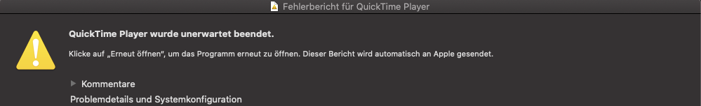 Hallo, ich habe leider ein Problem mit dem QuickTime Player. Er öffnet sich nicht mehr. egal ob ich es aus dem Launchpad oder aus der Taskleiste öffne, tut er dies nicht. Ich bekomme dann immer eine Fehlermeldung. Mein MacBook hat das neuste Software Update (macOS Catalina 10.15.7)