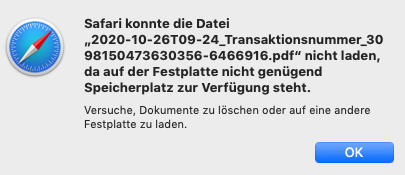 Seit einiger Zeit kommt beim Versuch Dateien über Safari herunterzuladen die Fehlermeldung, dass Safari die Datei nicht sichern könne, da die Festplatte voll sei. Man soll ein anderes Laufwerk auswählen oder Dateien löschen. Meine Festplatte ist nicht annähernd voll und beim Versuch die Datei auf einem USB oder separaten Laufwerk zu speichern, kommt die gleiche Meldung. Benutze ich einen anderen Browser funktioniert auch alles wie gewohnt...