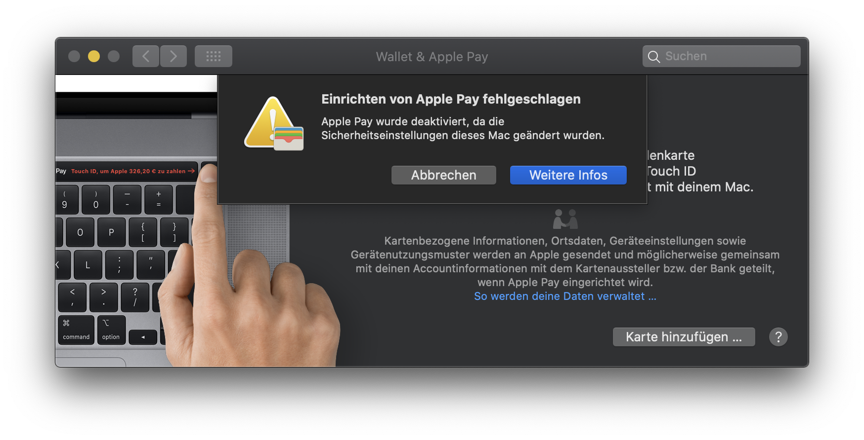 Obwohl ich alle Voraussetzungen aus dem zugehörigen Apple-Supportdokument erfülle, wird mir auf meinem MacBook Pro (13", 2020) die Fehlermeldung angezeigt, dass keine Karten zu Wallet hinzugefügt werden können: