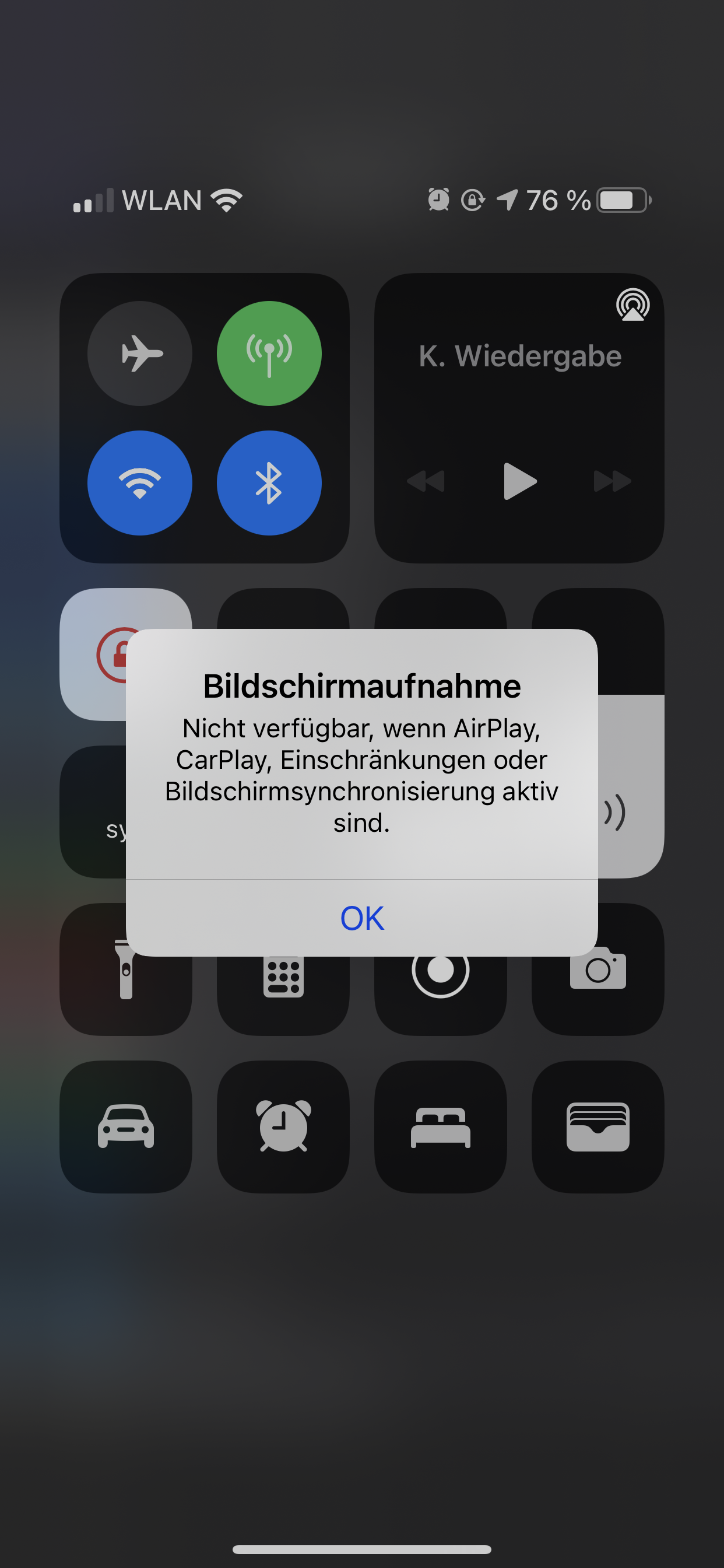 Hallo, plötzlich kann ich kein Bildschirmaufnahme mehr machen und ich bekomme die Meldung. Ich finde auch nicht wie man AirPlay oder CarPlay deaktivieren kann?