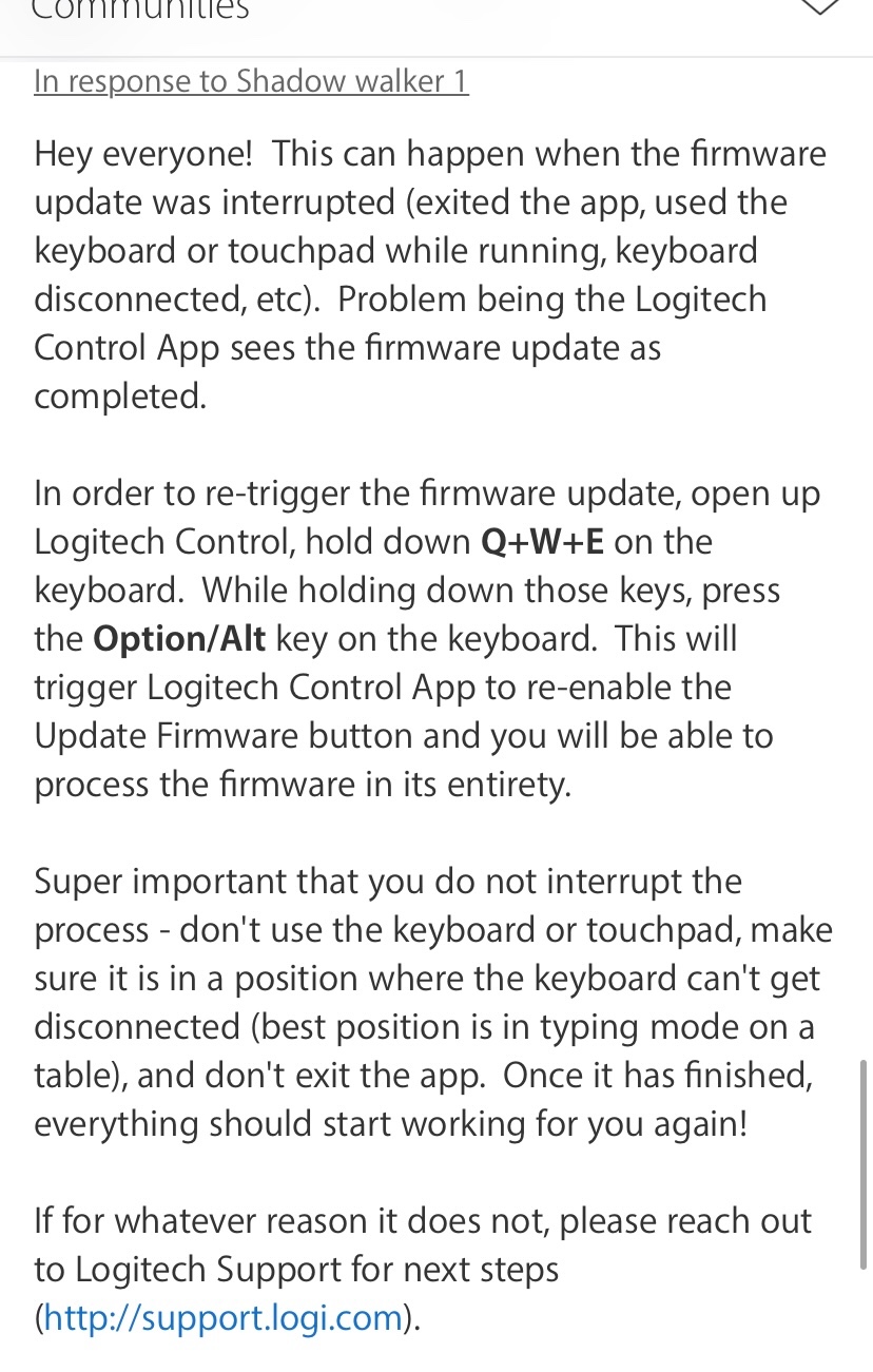 Leider musste ich feststellen, dass nach einem Firmwareupdate der Logitech-Tastatur über das Logitech Controller App das Trackpad nicht mehr funktionierte. (vor dem Firmwareupdate ging es noch)