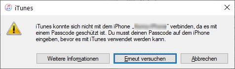 »iTunes konnte sich nicht mit dem iPhone "[xyz]" verbinden, da es mit einem Passcode geschützt ist. Du musst Deinen Passcode auf dem iPhone eingeben, bevor es mit iTunes verwendet werden kann.«