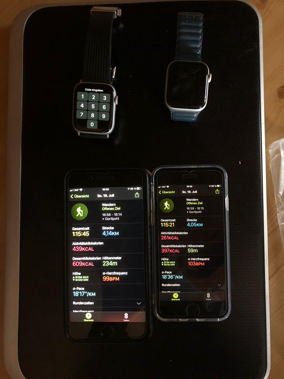 Mir ist aufgefallen, dass in der Trainingsapp (Wandern) die Höhenmeterangaben bei meiner Uhr scheinbar völlig unzutreffend ermittelt werden. Bei einer Wanderung mit rd. 500 HM zeigt m. Heute sind wir ein kurzes Stück exakt den gleichen Weg gegangen und die Uhren kommen zu völlig unterschiedlichen Messungen (s. auch aniegendes Bild).