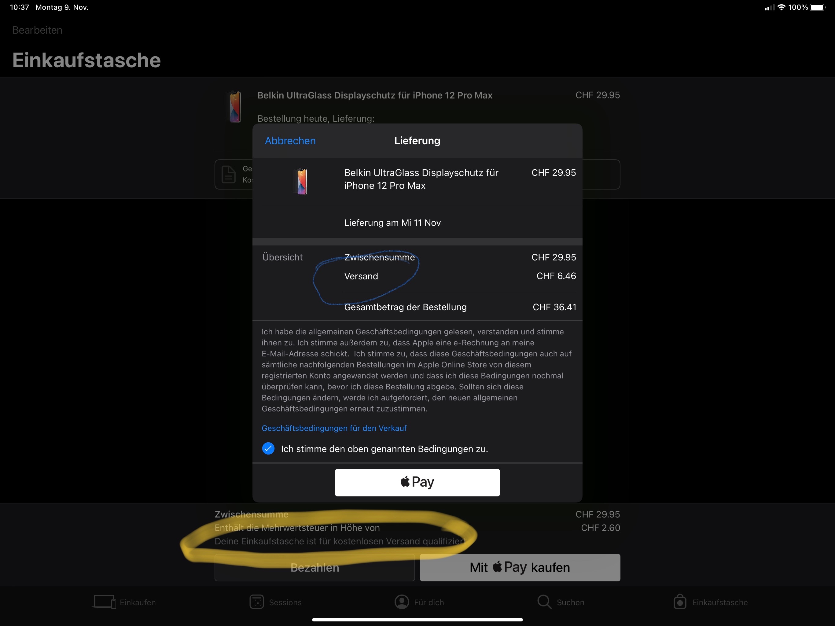 Beim Bezahlprozess wird mir dann aber der Preis für den Versand (6.46 CHF) draufgerechnet.