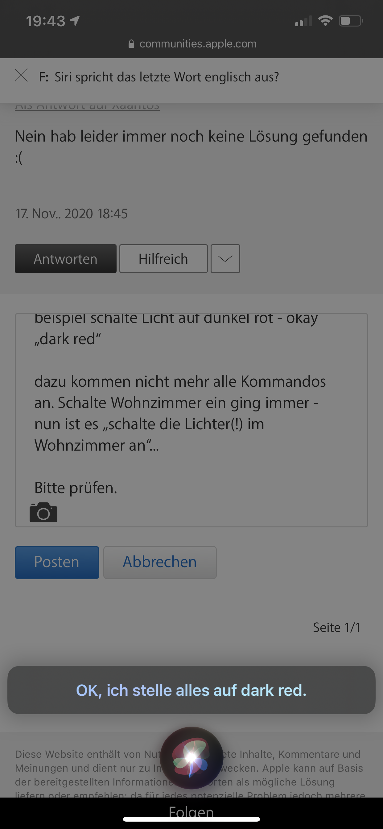 Ich hab mal eine Frage an euch, ich hab jetzt ca. seit 3 Wochen eine Smart Home Glühbirne, und wenn ich sag "Hey Siri, Licht Blau" hat Siri die Farbe zu der Sie die Lampe geänder hat auch immer in Deutsch ausgesprochen, aber seit Heute (09.11.2020) spricht Siri jede Farbe englisch aus, sprich Weiß-White, Blau-Blue und so weiter, obwohl ich nichts umgestellt habe oder sonst was :/ Habe iPhone11 Pro mit iOS 14.2