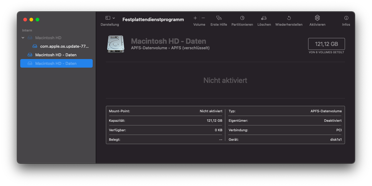 Im Festplattendienstprogramm ist die Platte/die Partition auch nicht ansprechbar.
