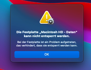 Sobald ich den Mac neu starte bekommen ich die Fehlermeldung, dass die "HD - Daten" nicht entsperrt werden kann (siehe Screenshot).