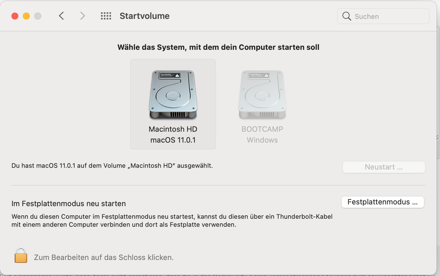 Die Windows 10 Installation lässt sich weder unter Big Sur zum Neustart auswählen (siehe Screenshot), noch kann ich Sie über das Auswahlmenü nach "Neustart + alt gedrückt halten" laden. Immer wenn ich darauf klicke lädt anschließend Big Sur.