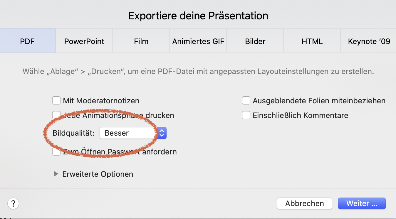 Wenn ich sie nun über Keynote in PDF konvertiere, hat die Datei plötzlich 400MB.