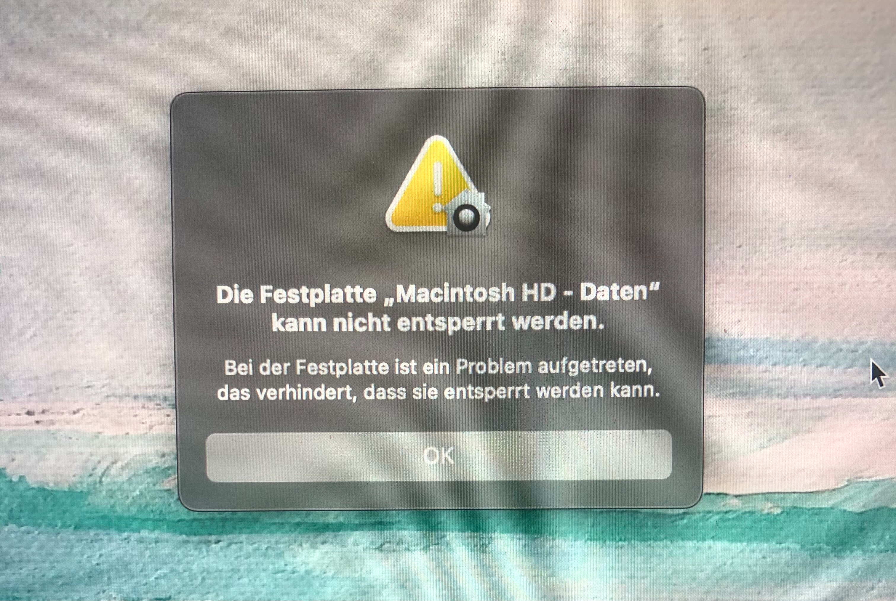 ich habe vor 2 Tagen auf meinem Macbook Pro 2019 das neue Update Big Sur geladen. Seitdem wird mir, nachdem er hochgefahren ist, angezeigt, dass die Festplatte „Macintosh HD - Daten“ nicht entsperrt werden kann. Ich kann ihn immer noch normal bedienen, also mir fällt nicht auf das irgendwas nicht stimmt. Kann mir jemand dazu ne antwort geben? Danke schonmal im Voraus :D