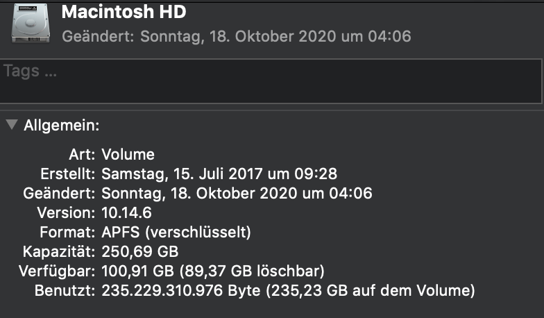 Jetzt kommt das Komische. Bei Macintosh HD wird mir angezeigt ich habe eine Kapazität von 250,69 GB, verfügbar sind 100,9 GB (wovon 89,54 GB löschbar sind), aber es sind bereits 235,21 GB auf dem Volumen benutzt?