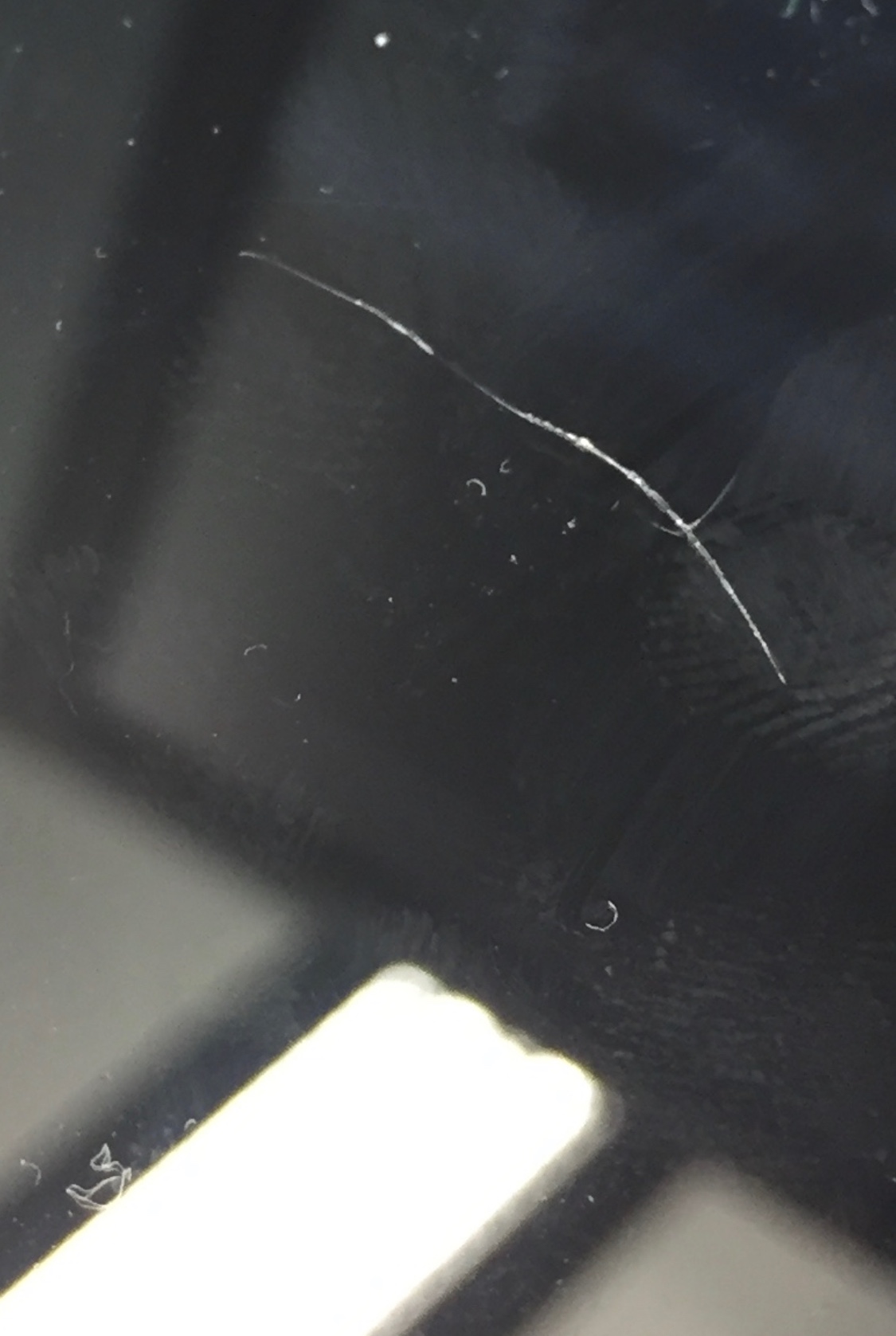 Unter der Lupe betrachtet ist das Glas an der vermeintlichen Druck- Kratzstelle ausgesplittert sh. Foto.