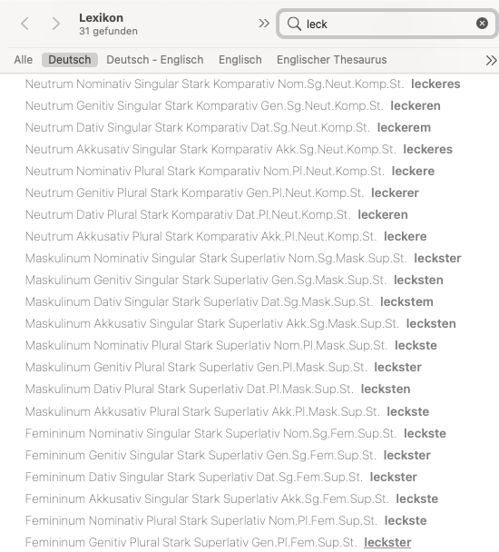Zweitens wird oft, wenn ich ein Wort eingebe, die Pluralform des gesuchten Worts zuerst angezeigt (etwa: Lexika statt Lexikon), obwohl es sich da um ein untergeordnetes Wort handelt. Vielleicht bilde es mir ein aber ich habe nicht in Erinnerung, dass dies auf früheren Versionen des macOS passiert wäre.