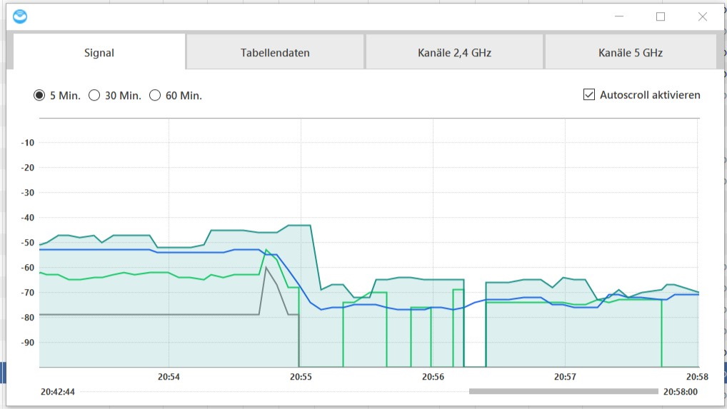 In verschiedenen Tests habe ich den Eindruck gewonnen, dass der Übergang zwischen den verschiedenen WLAN-Knoten des Mesh nicht korrekt vorgenommen wird. Im WLAN sind beide Frequenzbereiche (2,4 GHz und 5 GHz) aktiviert, beide Bereiche laufen unter dem gleichen Netzwerknamen.