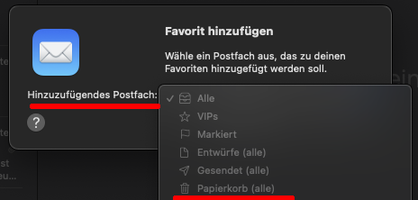 • Hinzuzufügendes Postfach "Papierkorb (alle) wählen