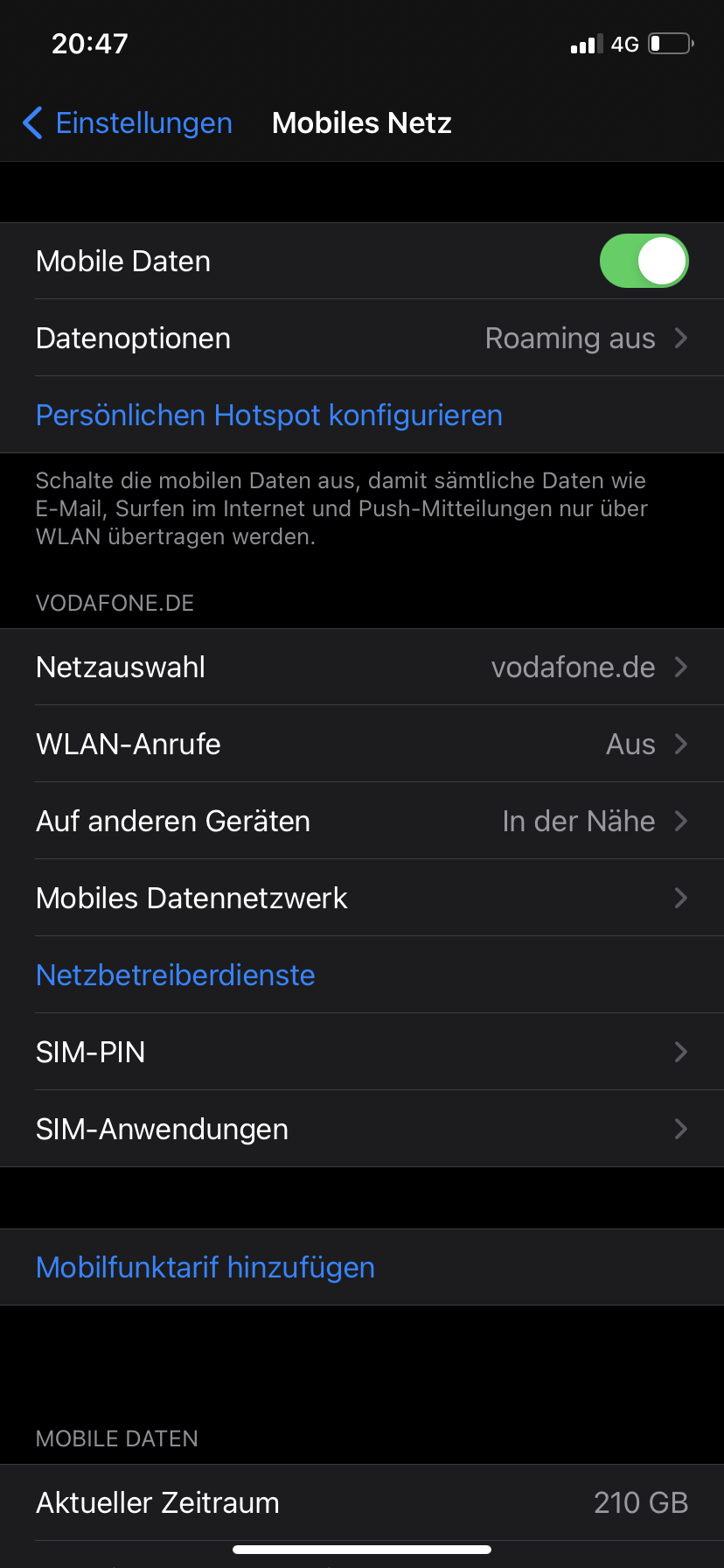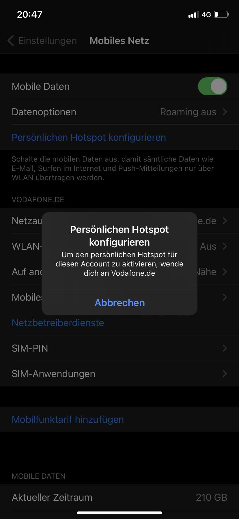 Aber in „Mobiles Netz“ steht „Persönlichen Hotspot konfigurieren“. Wenn ich da drauf gehe, wird „Um persönlichen Hotspotfür diesen Account zu aktivieren, wende dich an Vodafone.de“ angezeigt.