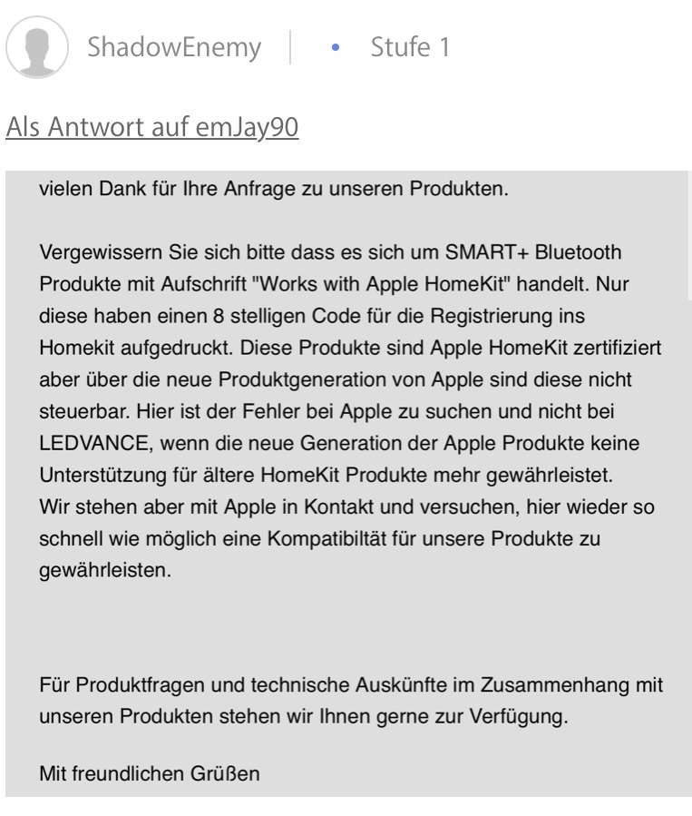Also hier auch nochmal aus einem anderen Beitrag kopiert, der Fehler liegt nicht bei Ledvance sonder bei Apple! Vielleicht bekommen die es ja doch noch hin, die „alten Geräte“ in die Apple Politik mit einzubinden. Totaler Unsinn mal wieder von Apple, seid ich mich mit IBM oder Mac beschäftige... abwärtskompatibel zu sein ist eigentlich garnicht so schwer 😂😂😂