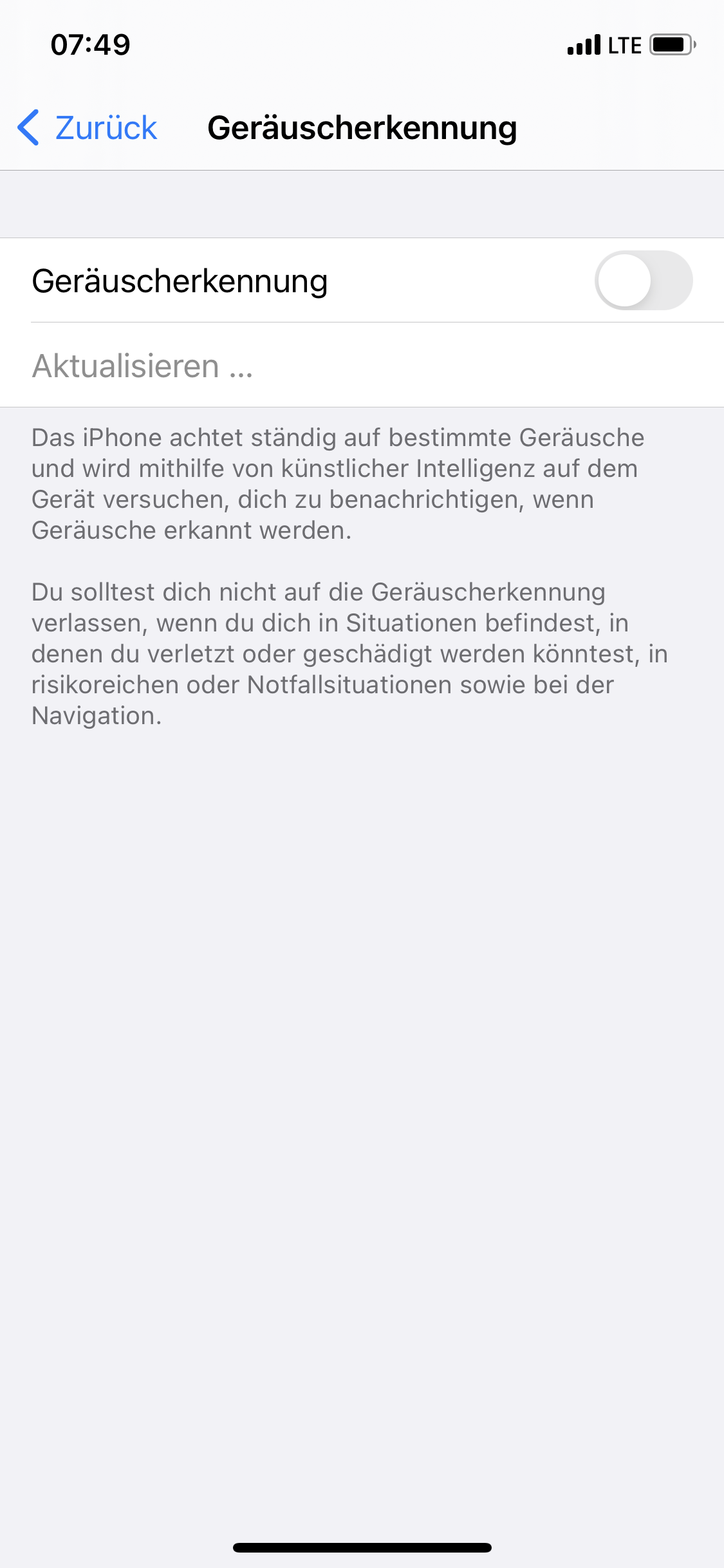Hallo, es gibt ein Problem mit meiner Geräuscherkennung. Seit Installation des Updates sieht das so aus. Sie lässt sich zwar ein- und ausschalten, aber konfigurieren. Ich habe Anlass zu der Vermutung, dass dieser Fehler auch für mein Siri Problem verantwortlich ist. Was kann ich da machen? Danke!