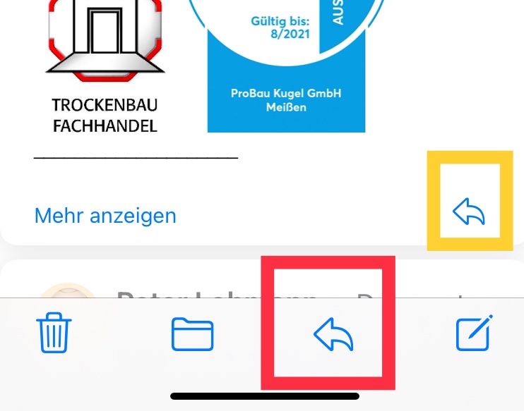 Ich öffne die Originalmail und tippe dann unten auf den Pfeil zur Antwort etc., aber das ist falsch. Dann kommt man in die Falle und antwortet den letzten dem man die Mail weitergeleitet hat.