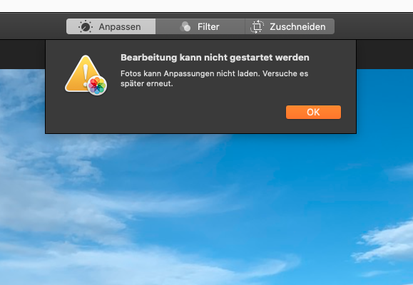 Bearbeitung kann nicht gestartet werden, Fotos kann Anpassungen nicht laden. Versuche es später erneut.