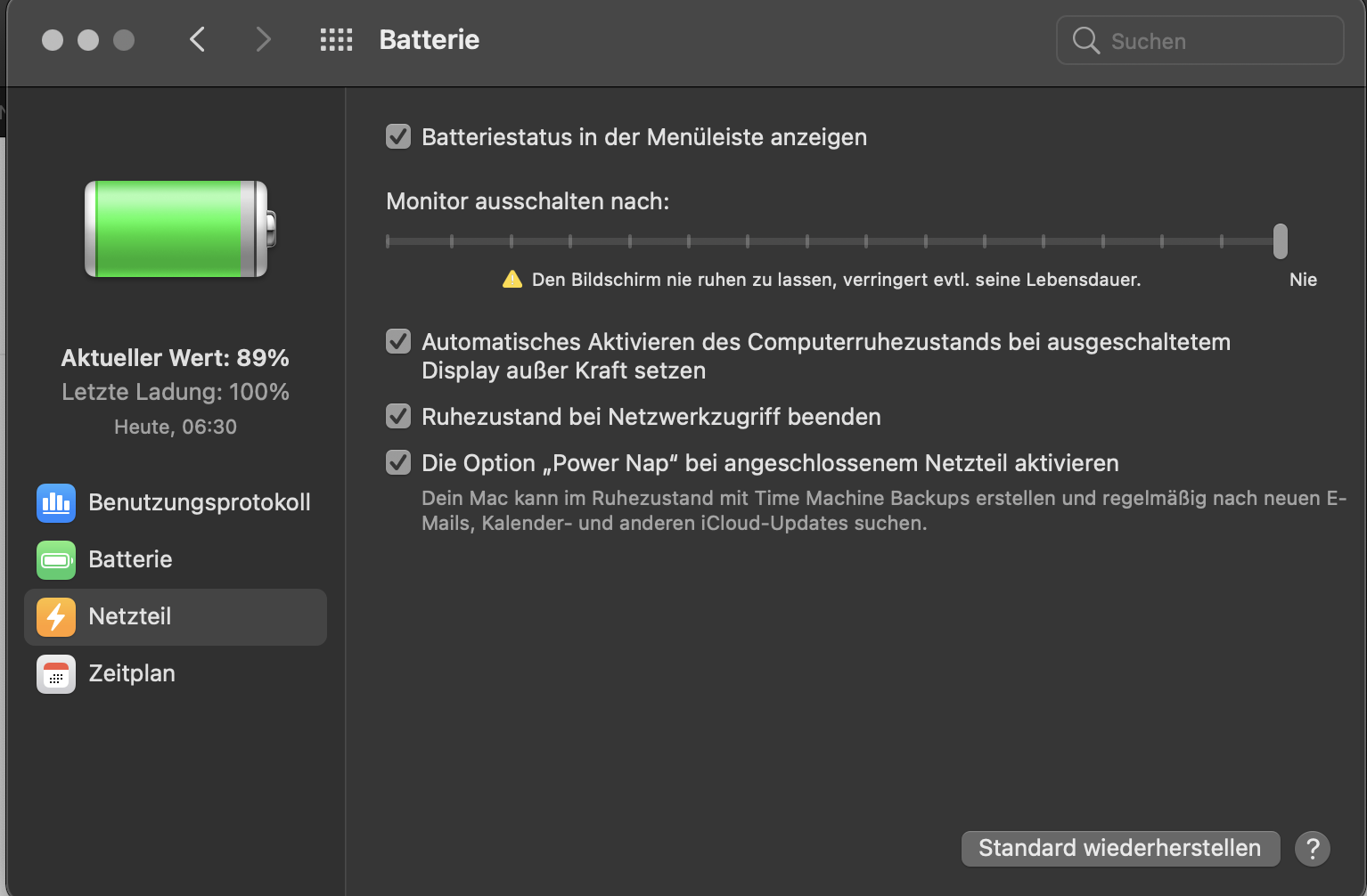 Ich poste anbei Screenshots von meinen einstellungen im Menü Batterie, falls es an denen liegen würde. Ich muss dazu noch sagen, dass ich erst seit Sommer ein Macbesitzer bin und noch nicht alles perfekt über die Einstellungen herausgefunden habe...
