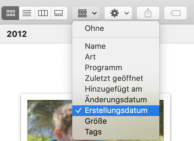Ich möchte die Fotos je Ordner chronologisch sortieren, also nach Erstellungsdatum. Wenn ich aber im jeweiligen Ordner die Fotos nach Erstellungsdatum sortiere (Foto), sind sie immer noch nicht in der richtigen Reihenfolge. Erst kommt ein Foto mit Erstellungsdatum 15. September 2012, dann eines mit Erstellungsdatum 11. November 2012, dann wieder 27. September 2012 und so weiter...