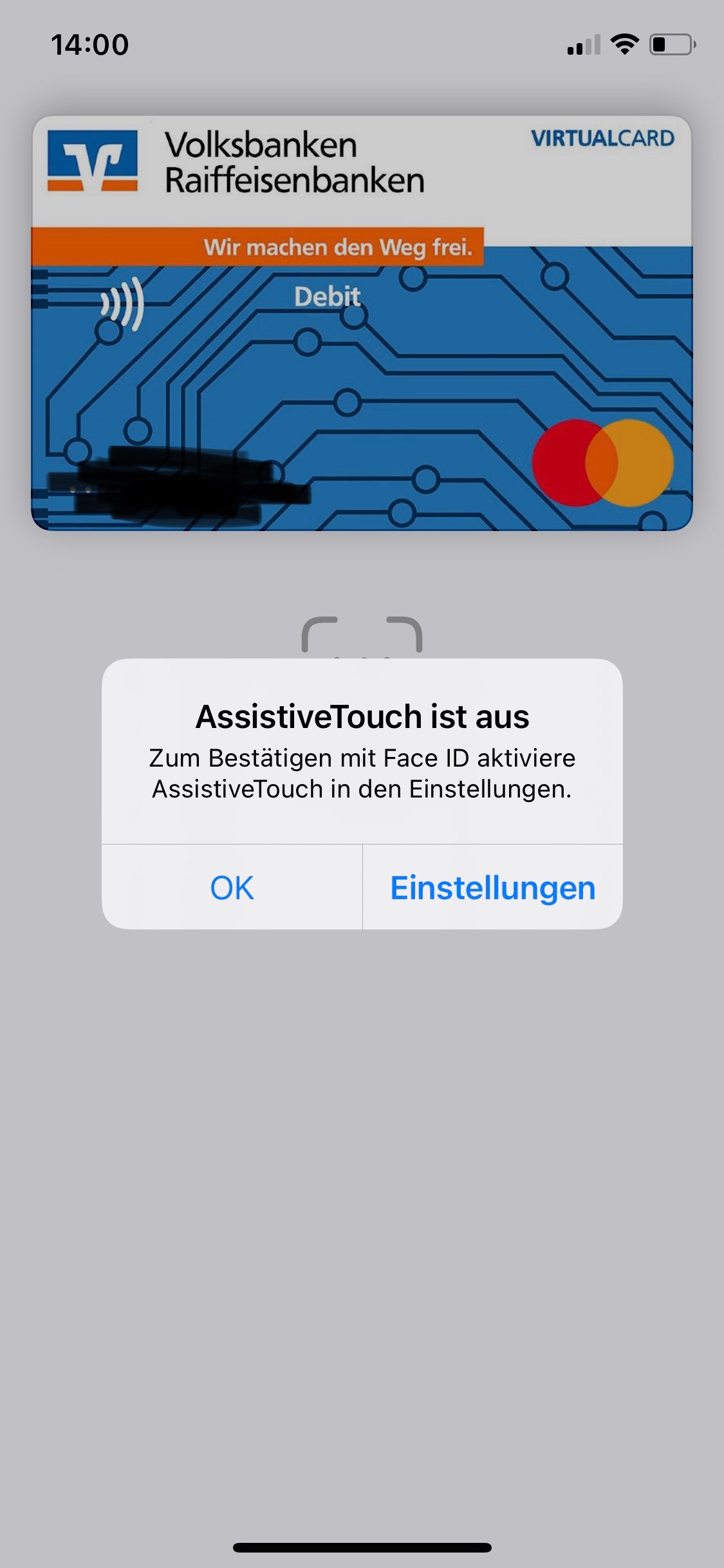ich habe gerade apple pay eingerichtet. Jetzt sagt mir meine Iphone X beim doppeltippen auf den seitlichen taster, das der assistive touch aus ist und zum bestätigen mit face id solle ich den assistive touch aktivieren. geht das nicht auch ohne den assistive touch bzw. wo kann ich es aktivieren, das er sofort face id zur erkennung nutzt?