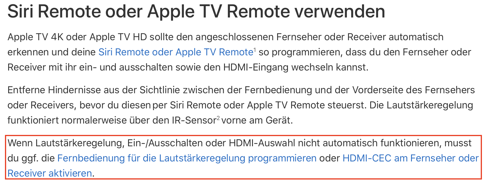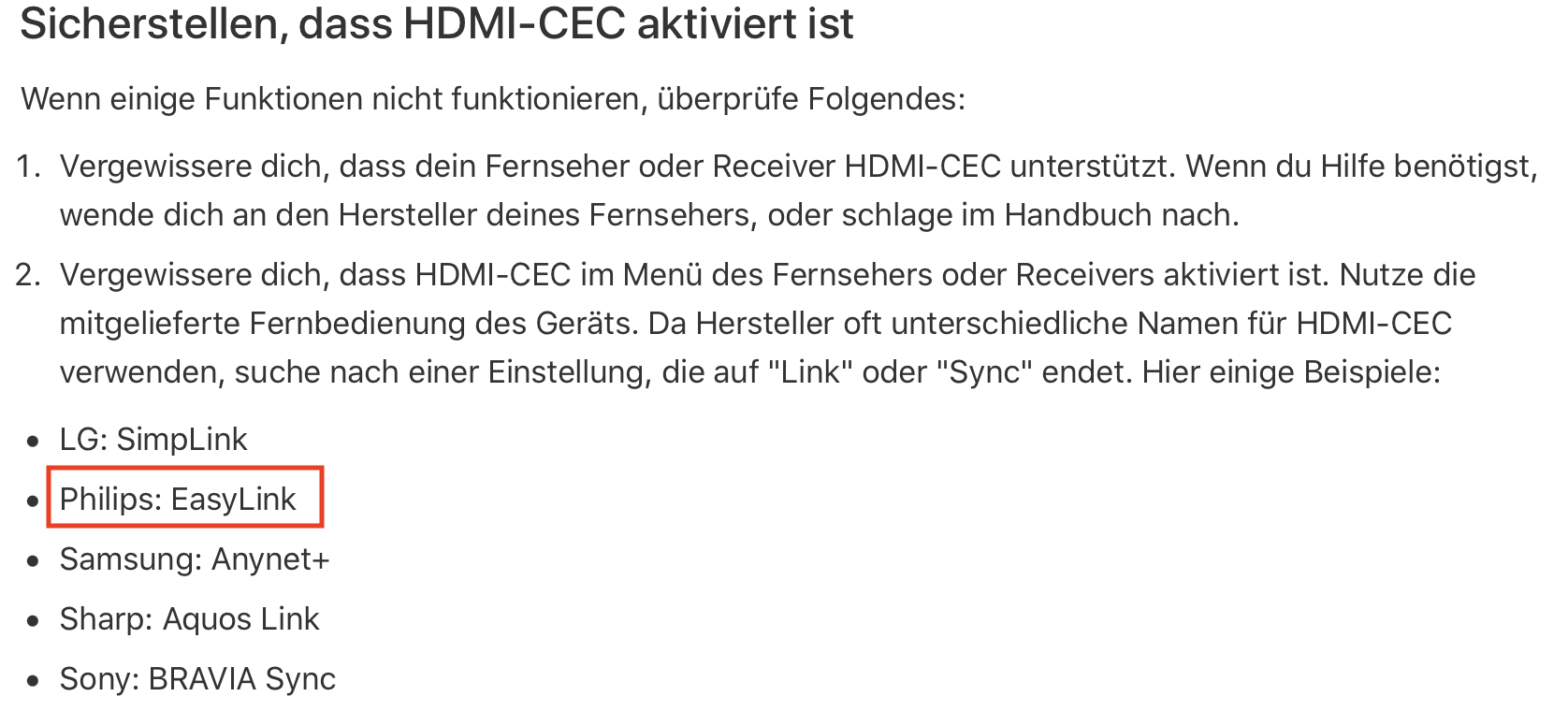 Ausschalten des Philips TV über die Apple TV 4k Fernbedienung funktioniert perfekt, aber anschalten nicht. Ich schleife das HDMI Kabel durch den AV Receiver und dann an den Fernseher.