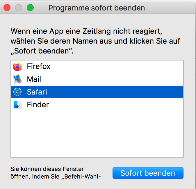 Dazu ALT+CMD+ ESC drücken, "Finder" markieren und "Sofort beenden" klicken.