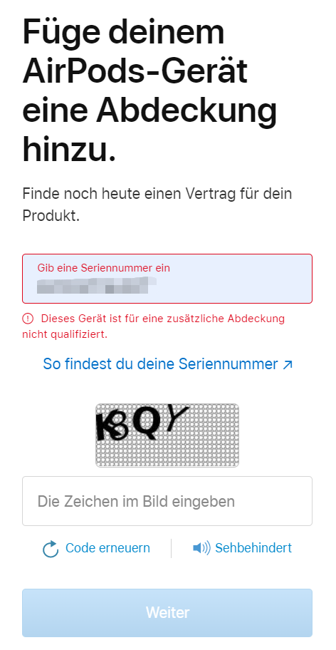 Die Erfahrung mit Airpods war gut, aber heute errinnere ich mich, dass ich es noch mal prüfen soll, ob mein Airpods richtig versichert ist. Dann hatte ich ein Problem bei der Angabe des Kaufdatums.