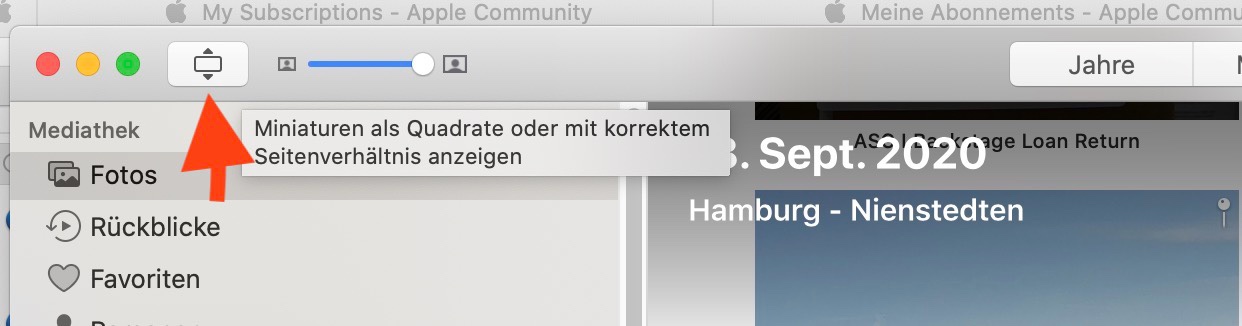 Und ist ein Fotos > Alle Fotos die gekachelte Darstellung ausgewählt oder das korrekte Seitenverhältnis? Du wechselst zwischen der gekachelten Darstellung ohne Rahmen zur Darstellung im korrekten Seitenverhältnis mit der Schaltfläche rechts neben der Ample in der Werkzeugleiste.