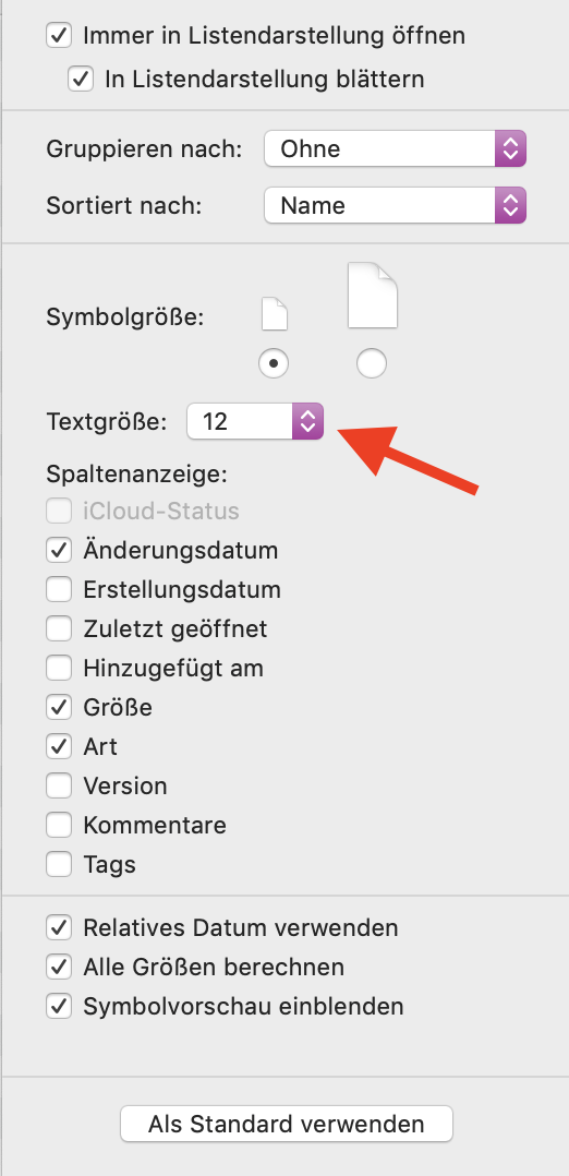 Mit welchen Tastenkombination auf der iMac-Tastatur kann man die Schriftgröße der Dateinamen-Auflistung im FINDER (iMac) vergrößern?