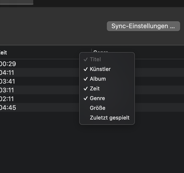 Anzeigen von Stücken auf dem iPhone per Klick auf den Button in der "Musik"-Seitenleiste in der Abteilung "Geräte". Ich möchte die iPhone-Anzeige in dem so geöffneten Fenster ändern: