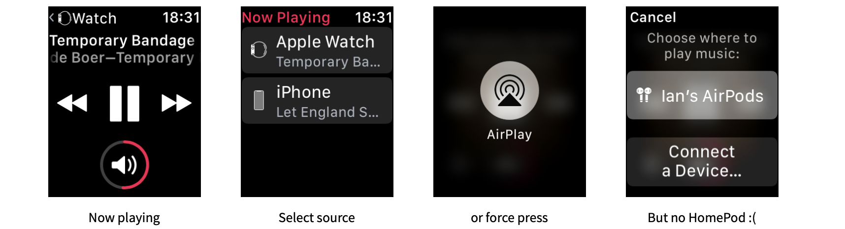 Die Musik App auf der Watch zeigt an, mit welchem Gerät diese verbunden ist. Nahezu immer sind das Kopfhörer. Immer aber Bluetooth-Geräte. Der HomePod ist nun was? Genau, eben kein kopplungsfähiges autarkes Bluetooth Gerät. Er benutzt den Blauzahn nur für die iPhone Kopplung im Slave-Modus. Damit kann er mit der Apple Watch auch nicht direkt verbunden werden.