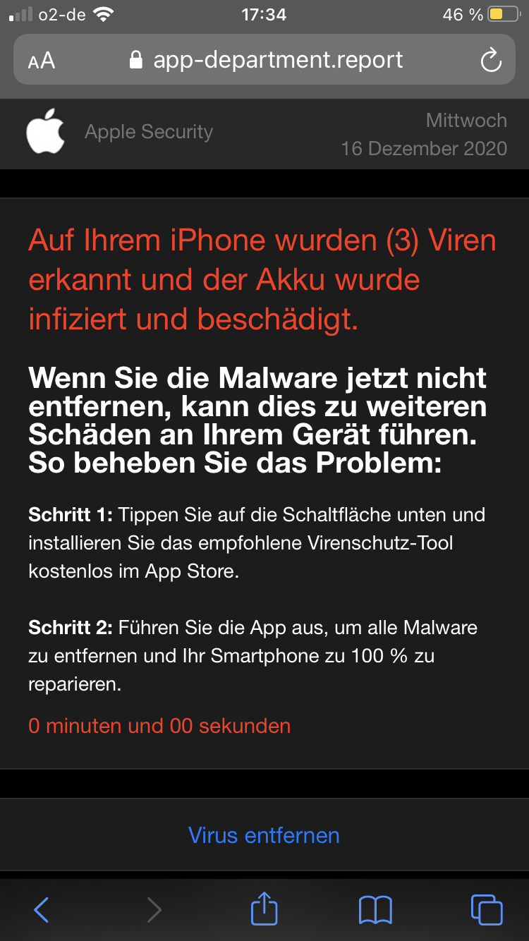 Ich bin auf Safari gegangen und als ich dann auf einen Tab wollte kam eine Virus meldung. Ich hätte (3) Viren auf meinem Handy, mein Akku sei attackiert und beschädigt worden seien. Darunter standen dann 2 schritte, ich wollte mir die App runterladen, da sie aber nicht geladen hat habe ich abgebrochen. Ist das echt? Habe ich ein Virus? Ich habe auch ein Foto davon! Soll ich es hochladen?
