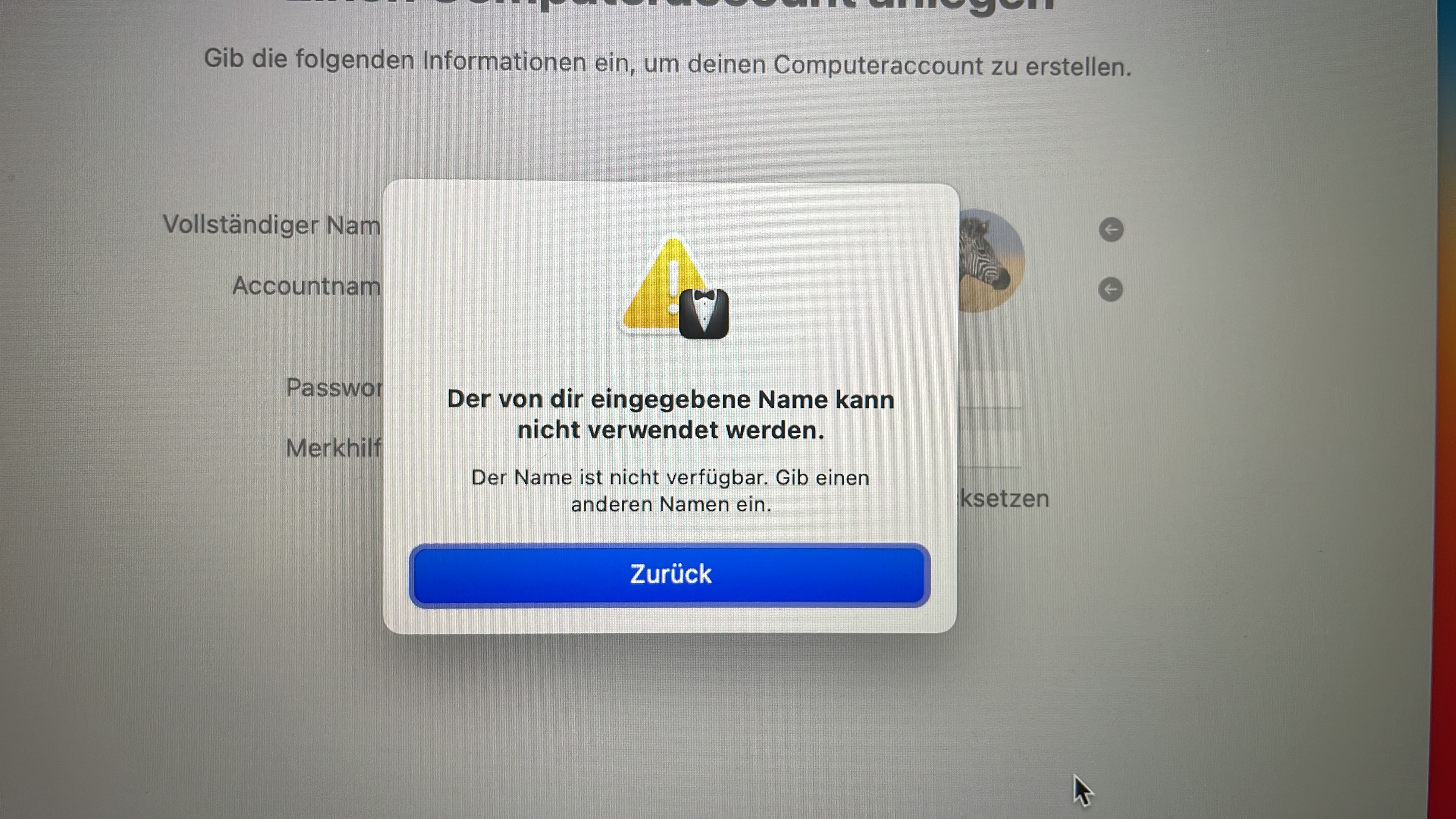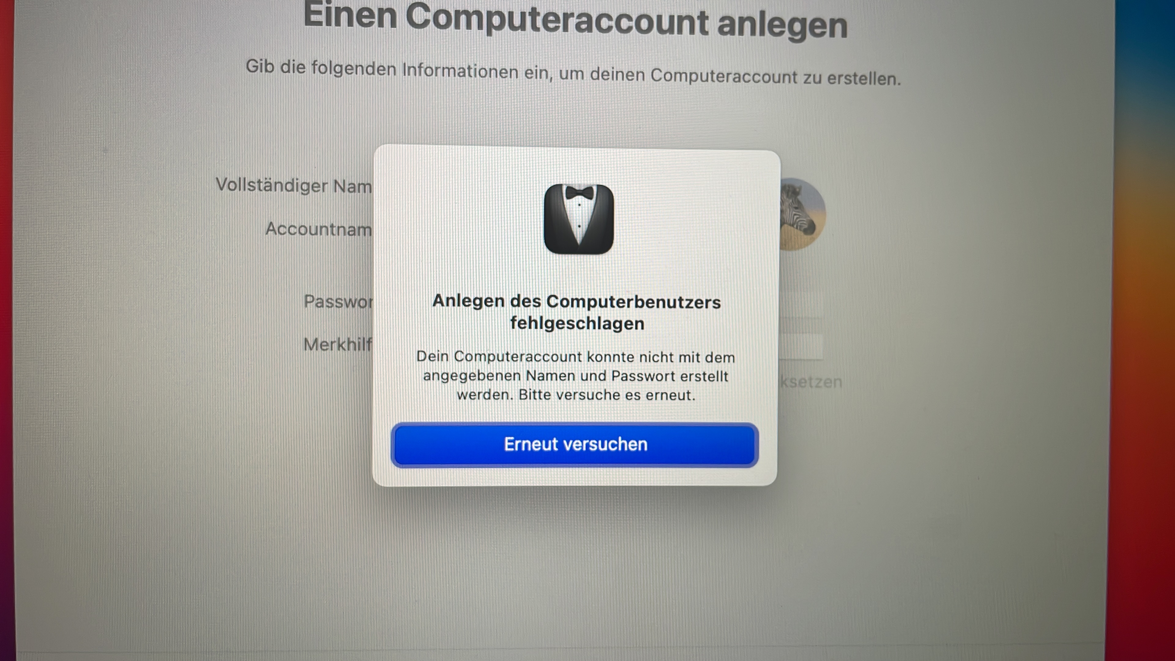 Hey, ich habe einen Mac mini M1 erworben aber sobald ich in das Feld "Einen Computeraccount anlegen" komme, kommt folgende Fehlermeldung "Anlegen des Computerbenutzers fehlgeschlagen". Dann drücke ich auf fortfahren nach der Fehlermeldung und es kommt die Meldung "Dieser name kann nicht verwendet werden benutze ein anderen" und das selbe Spiel geht solange wie ich will, am Ende hab ich nach einem Neustart 8 profile und angeblich sei das passwort falsch. Beim Wiederherstellung Modus schon 3 mal formatiert und big sur neuinstalliert.mit internet und ohne probiert. Hat jemand eine Idee?