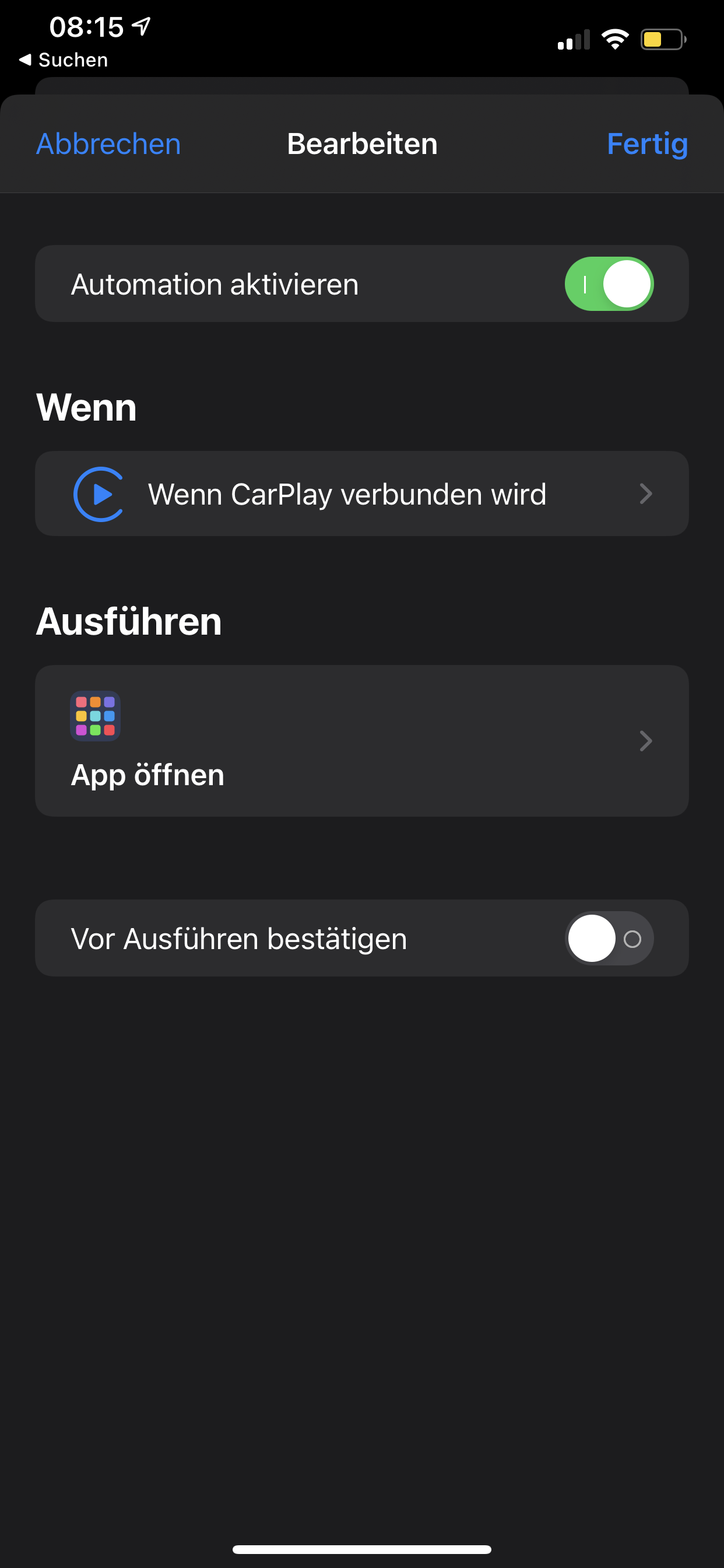 ich würde gerne auf meinem iPhone 11 Pro Max mit Hilfe der Kurzbefehle-App eine Automation erstellen, welche ermöglichen soll, eine App zu starten, sobald mein iPhone mit Apple CarPlay verbunden wird.
