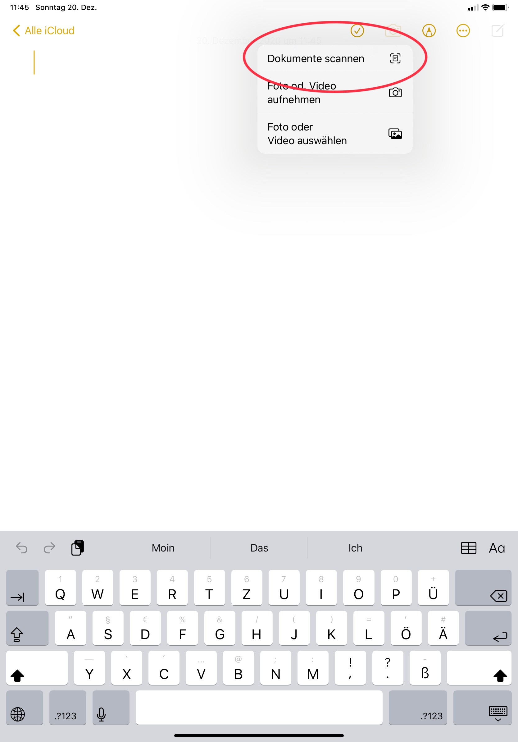 Du musst eine neue Notiz beginnen, oben auf die Kamera tippen und anschließend Dokument scannen wählen. Sh. Screenshot: