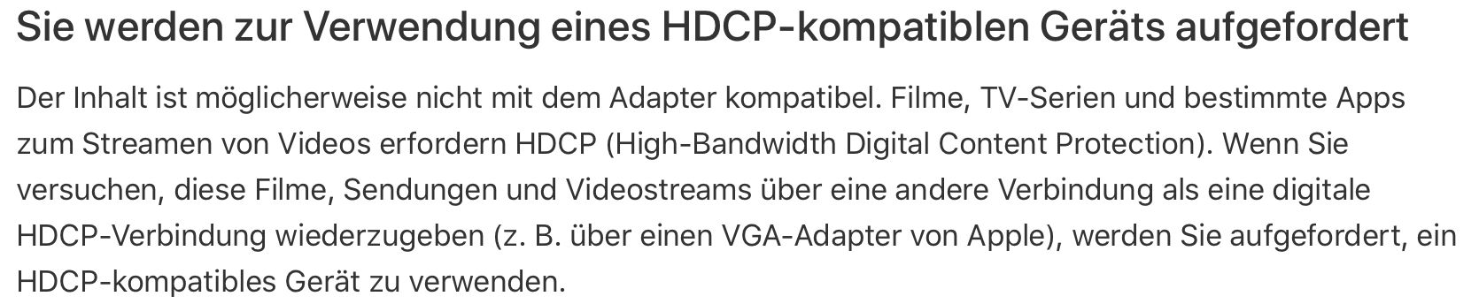 Viele auf dem Markt erhältliche Adapter (Lightning auf HDMI) kosten zum einen die Hälfte, vermerken allerdings zum anderen explizit, dass sie eben für meinen gewünschten Einsatz für Übertragung von HDCP nicht geeignet seien. Bein Original-Zubehör von Apple finde ich keinen solchen Vermerk und nur weil er mal fast das Doppelte kostet, möchte ich nicht in die Annahme verfallen, dass dann auch die HDCP-Übertragung inkl sei. Das möchte ich gerne vor Kauf wissen. Deshalb macht die Beantwortung meiner Frage durch einen Anwender am ehesten Sinn, der den Adapter für denselben Einsatz gekauft hat und benutzt.